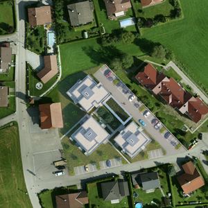 Dem in Richtung Nordosten diagonal ansteigenden Gelände entsprechend wird der Wohnhof mit den drei barrierefreien Hauszugängen inklusive Foyers auf ein einheitliches mittleres Niveau gesetzt.