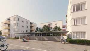 Links und rechts der gedeckten Vorbereiche zu den Foyers der Wohnungseingänge erfolgt die Abgrenzung zu den Erdgeschoßwohnungen über Hecken. Neben den Loggien/Terrassen sind den Erdgeschoßwohnungen Mietergärten zugeordnet. Die verbleibenden Flächen sind begrünt und mit Baumpflanzungen versehen und sind allgemein zugänglich.